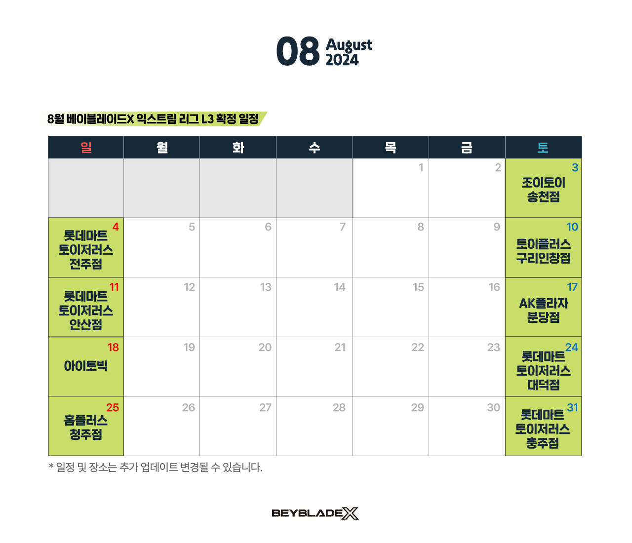 [베이블레이드X 익스트림리그] 2024 8월 L3리그 일정 (8/10, 11, 18, 24, 25 업데이트)